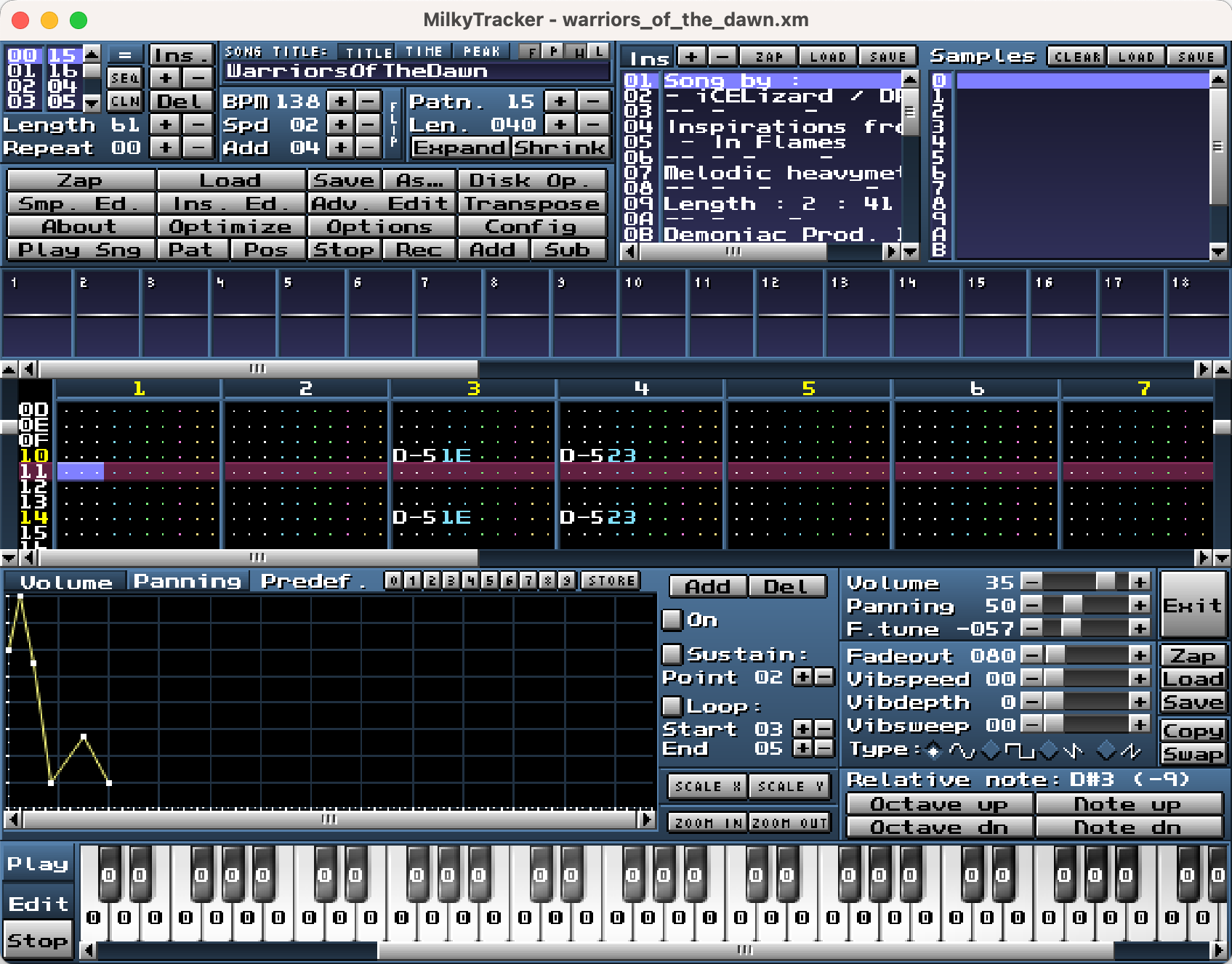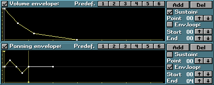 The XM instrument model makes it possible for the volume, period and panning of the note to change automatically over time without the explicit use of effects. The most impactful new instrument feature are probably envelopes.