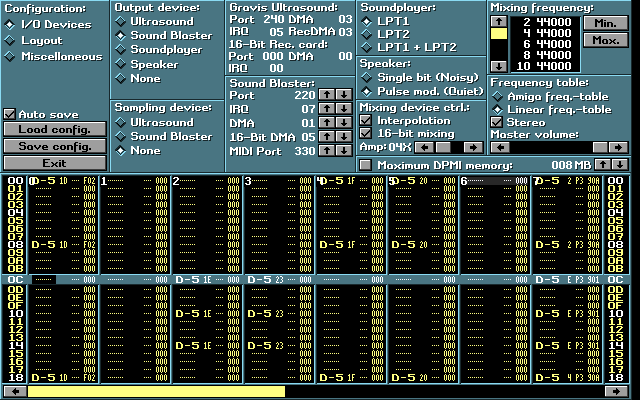 FastTracker II supported playback on a range of SoundBlaster-compatible cards, the Gravis Ultrasound (GUS), the internal PC speaker and (often home-made: [LPT1]) contraptions ([CST], [LPT2]) that attached to the computer’s parallel port. Playing samples on the PC speaker could sound surprisingly non-terrible if done well, and FastTracker actually did fine job at it. Using the speaker or parallel port for audio output was a thing in the early days of playing modules (and games) on aurally underprivileged PCs. The popular early-90s module player MODPlay, for example, came with instructions on how to build a device to get “mono output from a parallel port for around 1 pound.” By the time FastTracker II came out, such features were largely obsolete, as SoundBlaster-compatible cards would have been a standard component of any reasonable PC for years.