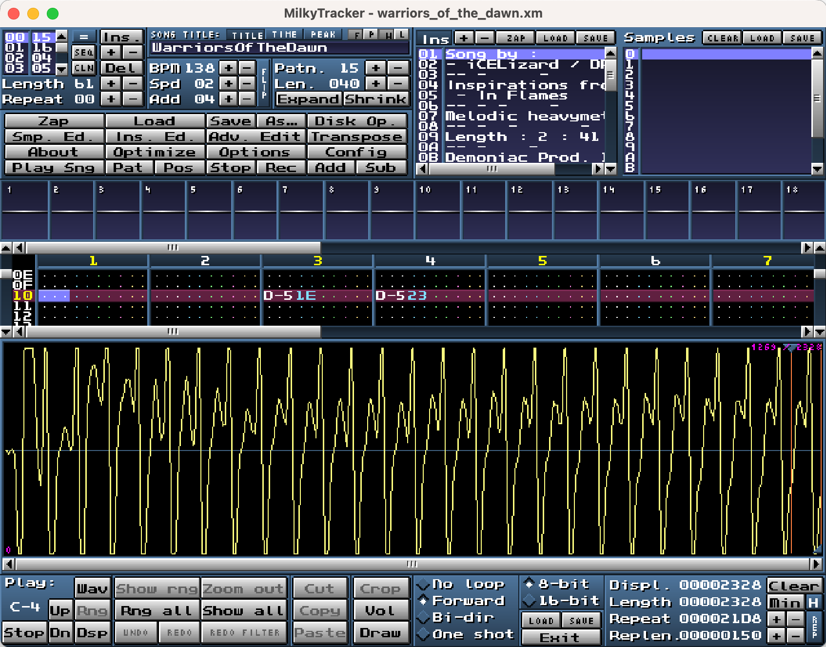 Improvements in playback quality are, of course, primarily tracker features rather than characteristics of the format. They are important to understand when creating a player, however, for at least two reasons. First, they set the standard that a player could try to emulate or surpass. Second, the fact that FastTracker II offered a range of options that ensure reasonably good playback quality frees today’s trackers and players from the obligation to exactly emulate a particular way of generating the sound output for authenticity. For example, since users could choose between 8 and 16-bit mixing at sample rates between 8 kHz and 44 kHz in FT2, it hard to argue that using floating point mixing at the audio driver’s preferred playback rate would result in audio output that’s noticeably different from what an original tracker or player could have produced. At the same time, composers are targeting a less uniform and restrictive playback environment, which means that they do not have to worry as much about technical details, tricks and constraints.