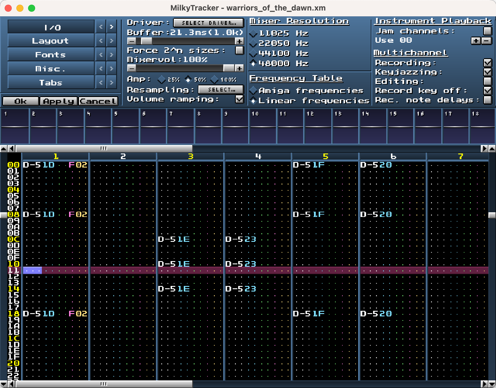 Today, the landscape may be somewhat different. Possibly the best tool for composing XM modules today is MilkyTracker, which has pledged to recreate the FastTracker II engine as faithfully as possible, including all its oddities. XMPlay is said to be highly compatible with FT2 as well, and in the light of all this, OpenMPT advises to turn on its many FT2 compatibility switches when creating XM modules, see [XMC]. It seems that today, the only right way to play an XM module is the FastTracker way, just as in 1994. If XM files are played back on “lesser players,” as the MilkyTracker manual [MTM] puts it, they might not play correctly.